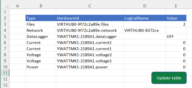 The advantage of this method is that it is extremely portable: you could even use it in the middle of nowhere with Microsoft 365 for the web, in combination with VirtualHub for web, to include data sent by a YoctoHub-GSM-4G in your Excel sheet.