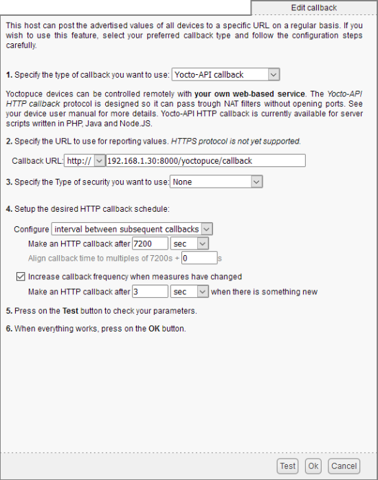 The only thing left to do is to configure the YoctoHub, or the VirtualHub, to connect to the HTTP callback with the URL of our server. In this case, the IP address of the machine is 192.168.1.30. The callback URL is therefore 192.168.1.30:8000/yoctopuce/callback.