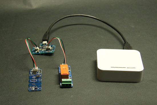 That's it. You can now connect Yoctopuce modules and connect yourself remotely on port 4444 of the MR3020 to read the values of sensors or drive relays. The Yoctopuce VirtualHub service starts automatically if you restart the machine. Unlike other cheap machines, the MR3020 is able to correctly power several Yoctopuce modules through a USB hub. Stay however with short USB cables.