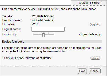 The only function provided by the Yocto-4-20mA-Tx module is "currentLoopOutput1" . Simply click on the corresponding rename button to assign it a new logical name.