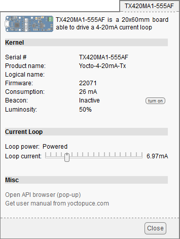 The first item to check is that your module is working well: click on the serial number corresponding to your module. This displays a window summarizing the properties of your Yocto-4-20mA-Tx.