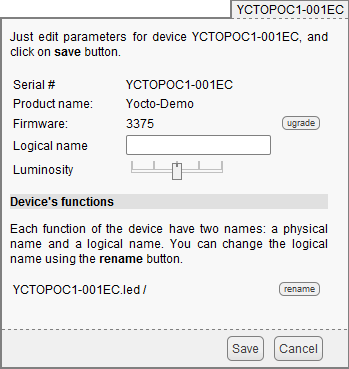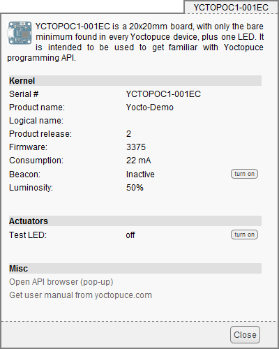 The first item to check is that your module is working well: click on the serial number corresponding to your module. This displays a window summarizing the properties of your Yocto-Demo.
