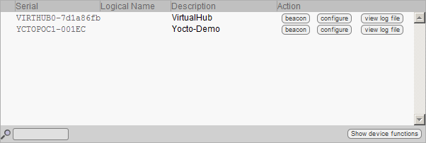 You can then physically localize each of the displayed modules by clicking on the beacon button. This puts the Yocto-led of the corresponding module in Yocto-beacon mode. It starts flashing, which allows you to easily localize it. The second effect is to display a little blue circle on the screen. You obtain the same behavior when pressing the Yocto-button of the module.