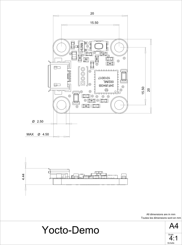 The Yocto-Demo module contains 2.5mm assembly holes. You can use these holes for screws. The screw head diameter must not be larger than 4.5mm or they will damage the module circuits. Make sure that the lower surface of the module is not in contact with the support. We recommend using spacers, but other methods are possible. Nothing prevents you from fixing the module with a glue gun; it will not be good-looking, but it will hold.