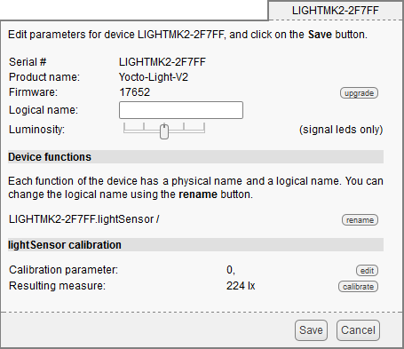 The only function provided by the Yocto-Light-V2 module is the "lightSensor" function. Simply click on the corresponding "rename" button to assign it a new logical name.