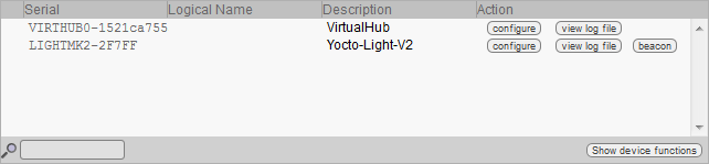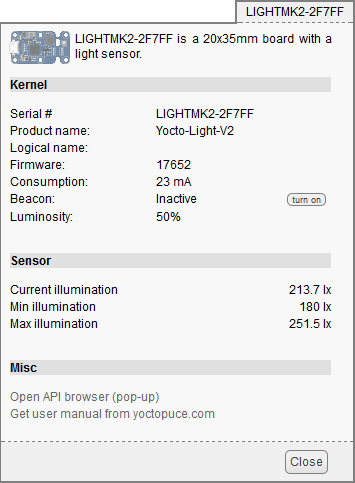The first item to check is that your module is working well: click on the serial number corresponding to your module. This displays a window summarizing the properties of your Yocto-Light-V2.