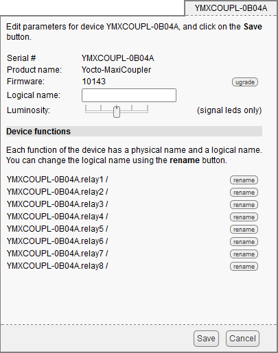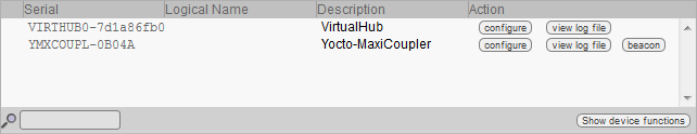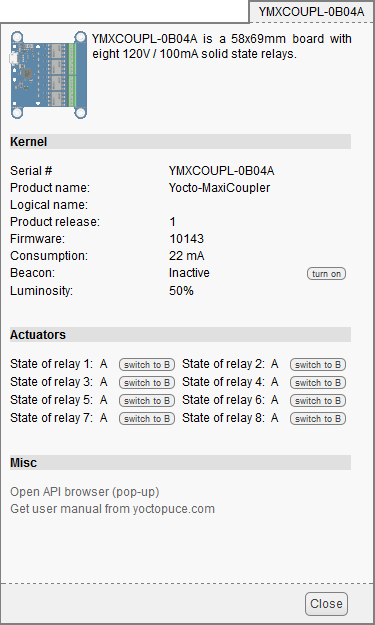 The first item to check is that your module is working well: click on the serial number corresponding to your module. This displays a window summarizing the properties of your Yocto-MaxiCoupler.