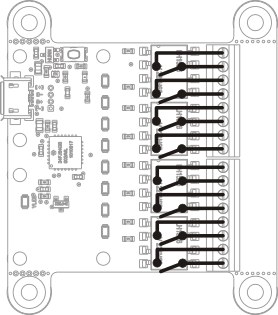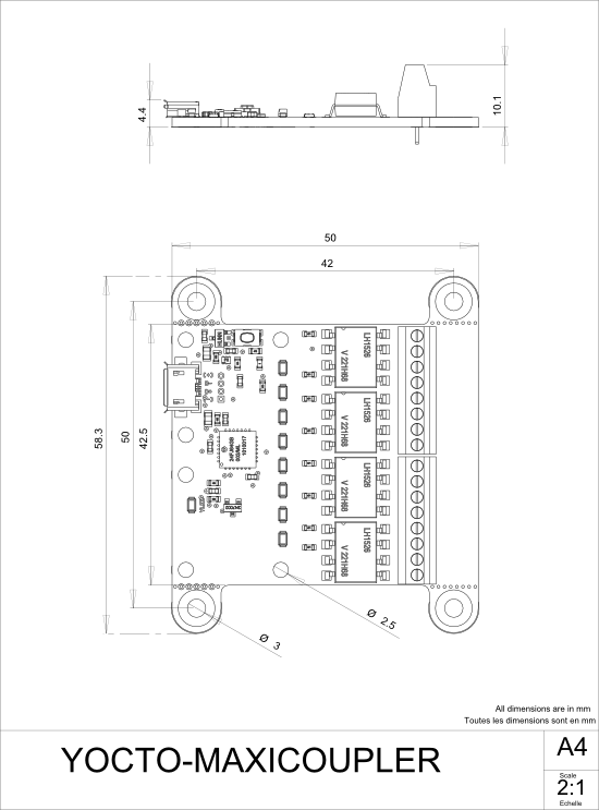 In order to mount the Yocto-MaxiCoupler module, you can put small screws in the 3mm assembly holes, with a screw head no larger than 8mm. The best way is to use threaded spacers, which you can then mount wherever you want. You can find more details on this topic in the chapter about assembly and connections.