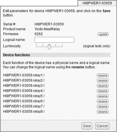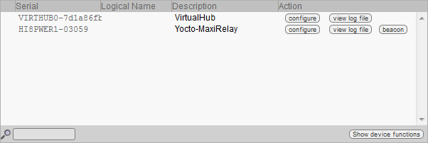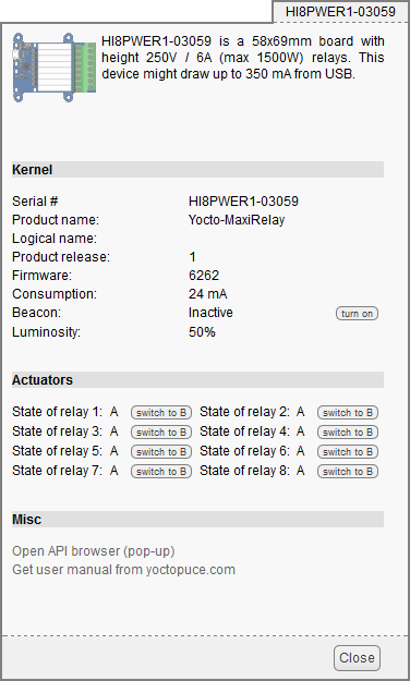 The first item to check is that your module is working well: click on the serial number corresponding to your module. This displays a window summarizing the properties of your Yocto-MaxiRelay.