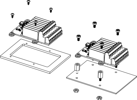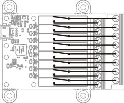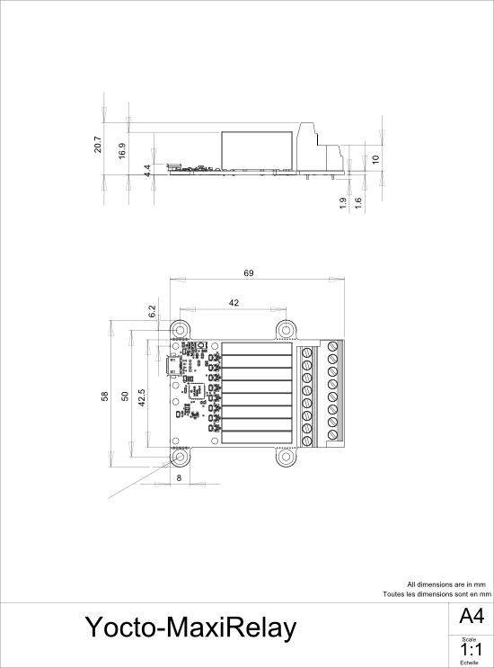In order to mount the Yocto-MaxiRelay module, you can put small screws in the 3mm assembly holes, with a screw head no larger than 8mm. The best way is to use threaded spacers, which you can then mount wherever you want. You can find more details on this topic in the chapter about assembly and connections.