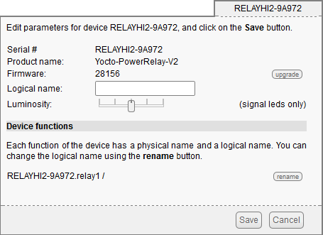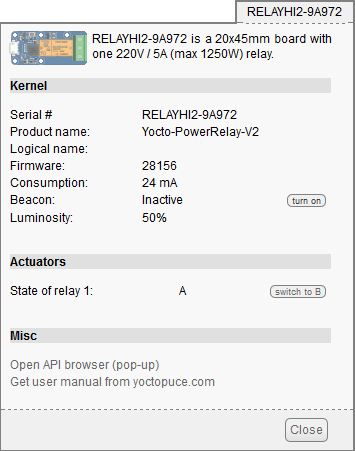 The first item to check is that your module is working well: click on the serial number corresponding to your module. This displays a window summarizing the properties of your Yocto-PowerRelay-V2.