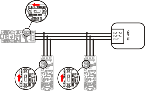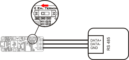 In the opposite to a classic serial communication which works only from point to point, RS485 devices can be organized in a bus. Each end of the bus must end with a 120Ω resistance. To avoid using an external component, such a termination resistance is embedded into the Yocto-RS485. You can optionally enable it with a micro-switch located right next to the terminal.