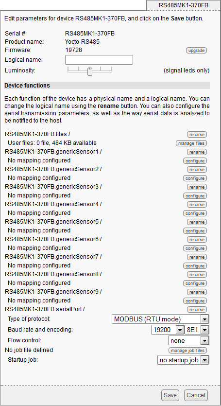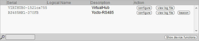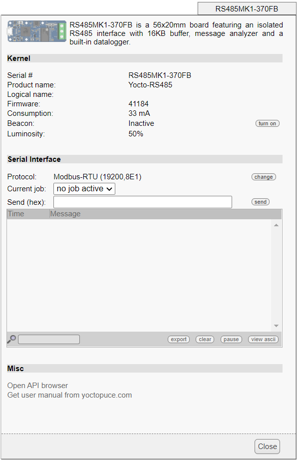 The first item to check is that your module is working well: click on the serial number corresponding to your module. This displays a window summarizing the properties of your Yocto-RS485.