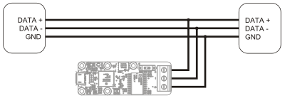 The RS485 input/output port of the Yocto-RS485 module is a terminal with DATA+, DATA-, and ground contacts. Cabling of an RS485 usually has these three wires, to which devices are cabled in parallel. Sometimes ground is left out from the bus, but this is a design weakness which works only when all the devices have a relatively similar ground. The EIA/TIA standard requires a ground wire.