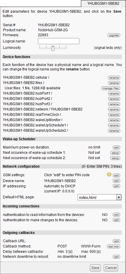 To use this feature, just click on the configure button located on the line matching the YoctoHub-GSM-2G on the main user interface. Then look for the Outgoing calbacks section and click on the edit button.