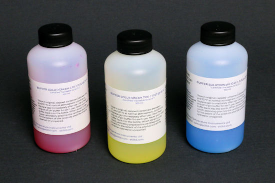 Pour effectuer la calibration, il vous suffit donc de vous procurer les solutions tampons usuelles de pH 4, 7 et/ou 10. Plongez la sonde pH dans chacune de ces solutions et pressez le bouton correspondant de l'interface.