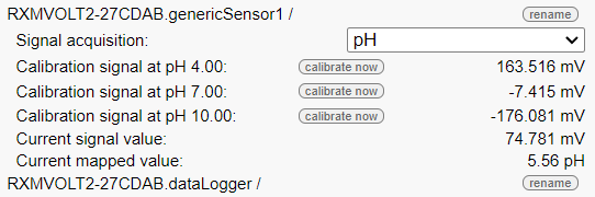 Dans le cas du Yocto-milliVolt-Rx-BNC, nous avons récemment amélioré son interface Web de configuration pour faciliter l'utilisation avec une sonde pH. Si vous mettez à jour le firmware de votre module, vous n'aurez plus besoin comme en 2014 d'effectuer des calculs pour effectuer une calibration avec des solutions tampon: la fenêtre de configuration offre désormais un mode d'acquisition "pH" avec trois boutons permettant d'effectuer cette opération en quelques clics:
