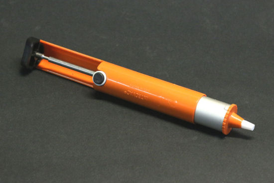 Une pompe à dessouder est une espèce de seringue à ressort: on l'arme en enfonçant le piston. En appuyant sur un bouton, le piston est violemment ramené en arrière ce qui crée une forte succion. L'idée est donc de faire fondre l'étain et de l'aspirer avec la pompe. C'est un outil parfois efficace pour les soudures traversantes, parfois moins. Honnêtement, ce n'est pas notre technique préférée.