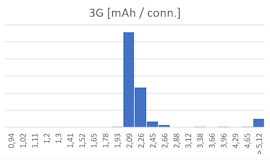 Le deuxième facteur est bien entendu la consommation électrique durant le temps où le module est allumé. Si on intègre la consommation instantanée (en mA) sur la durée de connexion en fraction d'heure, on obtient l'énergie nécessaire par transmission (en mAh). Cette mesure totalise l'énergie de tout le système, y compris le Yocto-Meteo qui prend les mesures. Voici la comparaison entre 3G et LTE-M: