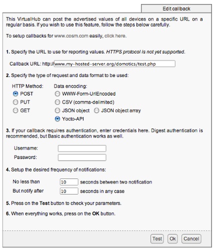 Pour configurer le callback du VirtualHub, ouvrez un browser sur l'interface du VirtualHub, cliquez sur le bouton configure, puis sur le bouton edit à côté de Callback URL et choisissez le réglage POST en mode Yocto-API, comme ci-dessous: