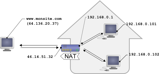 Transposé en terme de réseau, cela donne ceci: les appareils connectés sur votre réseau domestique peuvent communiquer entre eux en utilisant une adresse IP locale (du genre 192.168.xxx.yyy), et contacter des serveurs sur Internet par leur adresse publique, mais vu de l'extérieur, vous n'avez qu'une seule adresse IP officielle, attribuée à votre routeur DSL exclusivement, et vos différents appareils réseau ne sont pas directement atteignables depuis l'extérieur. C'est assez contraignant, mais c'est en réalité grâce à cela que les virus informatiques ne peuvent pas profiter trop facilement à distance des vulnérabilités présentes dans les ordinateurs du commun des mortels.