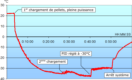 Ouvrir la trappe en cours de fonctionnement fait clairement perdre quelque degrés qui peuvent mettre du temps à se résorber. La meilleur technique est apparemment de charger la boîte de pellets, attendre que l'ensemble se refroidisse et que la température arrive un peu en dessous de la valeur recherchée puis à nouveau ouvrir la trappe, charger à fond et seulement commencer l'expérience. On peut ainsi maintenir -30°C dans la boîte pendant environ 90 minutes sans avoir à la remplir à nouveau.
