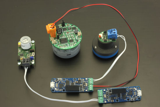 Les capteurs n'ont pas tous le même format, mais tous se branchent de la même manière au Yocto-4-20mA-Rx, avec simplement deux fils: l'un connecté à l'alimentation 23V, l'autre connecté à l'entrée de la boucle de courant. La troisième borne (terre) ne doit pas être connectée. La documentation des capteurs ECO-SURE et O3 précise que la polarité n'est pas importante (le capteur inclut un redresseur); pour les capteurs de la série T3, nous branchons le fil rouge sur le 23V et le noir sur l'entrée de la boucle de courant.