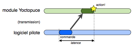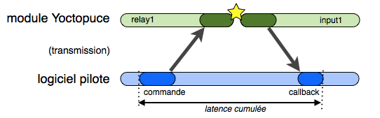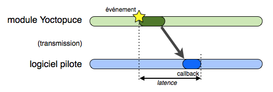 Cette méthode ne prend quasiment pas de temps au programme de contrôle (< 1ms dans tous les cas) puisque tout est fait en amont dans le module Yoctopuce. Par contre, comme pour le cas précédent d'une commande, il se pose la question de la latence: combien de temps se passe-t-il entre l'événement réel et l'appel du callback dans le programme de contrôle ? Arrive-t-on dans tous les langages à limiter la latence de sorte à donner l'impression de la simultanéité ?