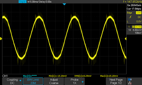 On est donc ramené à la mesure d'une faible tension proportionnelle au courant à quantifier, mais il s'agit cette fois d'une tension alternative. Voici par exemple à quoi ressemble la sortie de notre pince ampèremétrique pour une charge résistive de 1A environ: