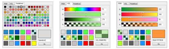 La version 2 offre une bien meilleure gestion des couleurs: l'alpha-transparence est supportée et surtout vous disposez maintenant d'une interface de définition de couleurs qui permet de faire votre choix dans l'espace RGB, l'espace HSL et une liste de couleur prédéfinie. Elle se souvient même des dernières couleurs que vous avez choisies afin de vous permettre de les retrouver rapidement.