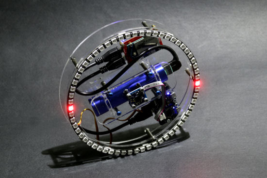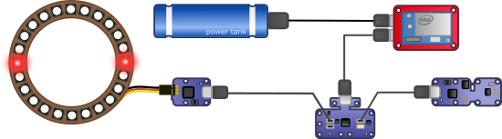 L'idée est très simple: sur le mini-PC Intel Edison, un petit script python mesure l'orientation de la roue à l'aide du Yocto-3D-V2 et affiche un motif correspondant sur l'anneau de LEDs NeoPixel à l'aide du Yocto-Color-V2. Comme l'Edison n'a qu'un seul port USB, on a utilisé un Micro-USB-Hub-V2 pour connecter les deux modules.