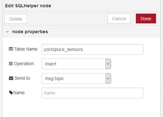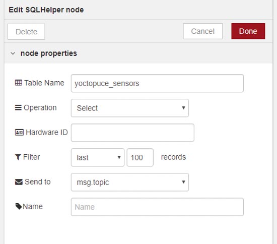 Nous avons aussi ajouté un nœud YSQLHelper qui permet de générer les requêtes SQL pour ajouter et récupérer les données d'un senseur Yoctopuce dans une base de données.