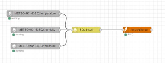 L’opération Insert permet d'ajouter un enregistrement à la table. Si la table n'existe pas, elle est automatiquement créée. Concrètement, voilà le schémas qui permet d'ajouter les valeurs du capteur METEOMK1-63E02.temperature à une table "yoctopuce_sensors" dans une base de donnée SQLite: