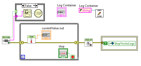 Par contre vous remarquerez que si vous appuyez sur le bouton STOP, l'application ne s'arrête pas. C'est parce que VI de récupération des logs continue à tourner. Pour régler ce problème, placez le VI StopYoctoLogs dans votre Block diagram. C'est en fait une variable booléenne globale, mettez-la à True à la fin de votre application et le tour est joué.