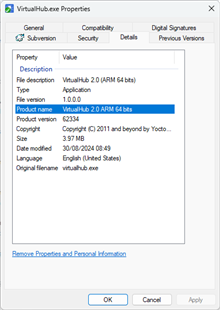 Pour VirtualHub v2, le binaire ARM se trouve dans le sous-répertoire arm64. Attention à ne pas le confondre avec le binaire Intel 64 bits qui se trouve dans le sous-répertoire amd64. Si vous avez un doute, vous pouvez consulter les propriétés de l'exécutable.