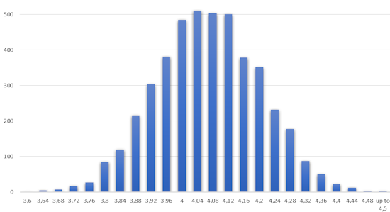 Lorsque la tension d'alimentation passe en dessous de 4.5V, vous risquez de perdre la communication USB entre l'hôte et le module. En effet, celui-ci va estimer que la chute de tension correspond à une déconnexion, et stopper la communication. La tension exacte à laquelle cette déconnexion se produit n'est pas spécifiée précisément par Microchip, qui fabrique le microcontrôleur que nous utilisons. Nous l'avons donc mesurée sur 5'000 modules issus de différentes livraisons de Microchip, et avons obtenu la statistique suivante: