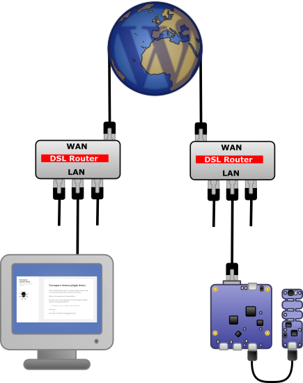 Le scénario d'utilisation suppose une interaction entre trois entités au moins: le capteur Yoctopuce qui prend une mesure, le serveur WordPress hébergé sur un serveur quelque part sur la planète et le navigateur internet de l'utilisateur, qui n'est a priori pas à côté du capteur. De plus, dans une utilisation habituelle, on doit supposer que tant le capteur Yoctopuce que le navigateur internet sont derrière un filtre NAT, comme par exemple un routeur DSL ou un pare-feu.