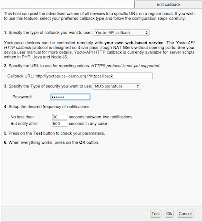 - Le mot de passe utilisé pour sécuriser vos callbacks (par signature MD5), qui permet d'éviter que quelqu'un d'autre vienne poster des fausses mesures sur votre site. Vous devrez configurer le même mot de passe dans la configuration de l'extension Yocto-Sensor:
