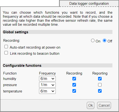 - Dans l'interface de configuration des capteurs eux-mêmes, la fenêtre de configuration du datalogger permet de choisir la fréquence d'envoi des mesures (reporting) du capteur vers le hub. Cette fréquence d'envoi détermine le moment de l'envoi de la mesure par le capteur: si vous choisissez de transmettre une mesure par minute, l'envoi de chaque nouvelle mesure aura lieu exactement au moment exacte ou l'heure courante passe à une nouvelle minute.