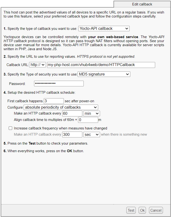 Configurez ensuite un callback HTTP sur votre YoctoHub-GSM-4G pointant sur votre serveur VirtualHub (for Web). L'URL de callback doit correspondre à celle de votre interface Web, mais sans le préfixe https:// et en remplaçant webapp.html par le suffixe HTTPCallback .