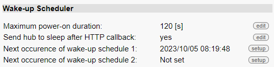 Enfin, pour économiser la source d'énergie du hub, il faut configurer la mise en sommeil profond du hub une fois les mesures transmises au serveur. Le premier réglage, appelé Maximum power-on duration et se trouvant dans la configuration du YoctoHub-GSM-4G sur le hub lui-même, sert à mettre le hub en sommeil profond après un temps d'éveil spécifié, que la connexion ait pu être établie ou pas: