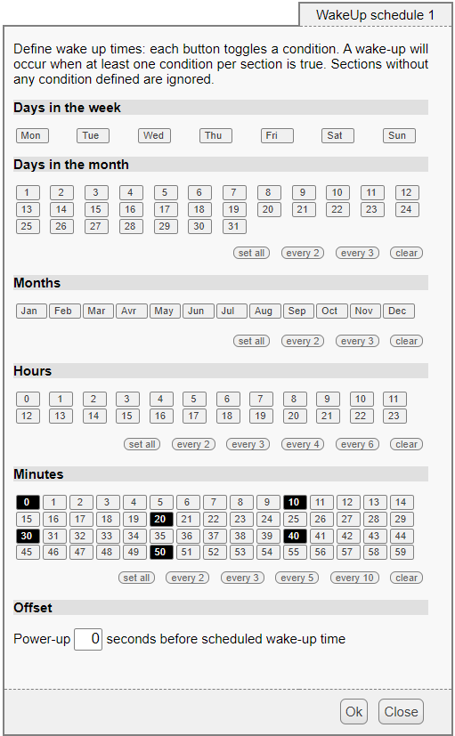 - Dans la fenêtre de configuration du YoctoHub-GSM-4G, le Wake-up scheduler permet de choisir les heures exactes de réveil du hub, lorsqu'on choisit de mettre le hub en sommeil profond entre les envois de données. C'est donc ce paramètre qui sera le plus important pour choisir la fréquence d'envoi lorsque l'on veut minimiser l'énergie consommée par le système.
