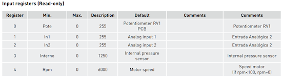 La liste des registres MODBUS figure sur la dernière page du manuel, dans une traduction assez approximative mais néanmoins utile. Il y a cinq registres d'entrée: