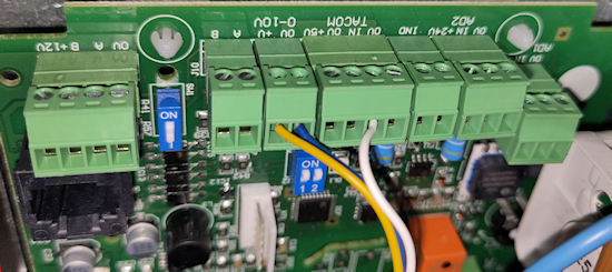 Le bornier RS-485 est tout à gauche, devant le connecteur RJ45 de la télécommande