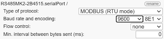 La ventilation travaille par défaut 9600bps, 8 bits de donnée, parité even. À l'aide de VirtualHub, nous configurons donc le module Yoctopuce comme suit:
