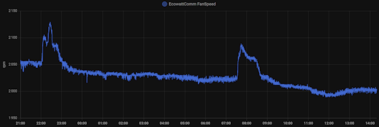 On constate effectivement une accélération du moteur vers 22h, alors que quelqu'un a prenait une douche, et une deuxième accélération le lendemain matin, à l'occasion d'une autre douche. Le système réagit donc à l'augmentation d'humidité comme prévu. La variation de régime, de l'ordre de 5% seulement, est pourtant moins important que nous l'aurions imaginé. Pourquoi ?