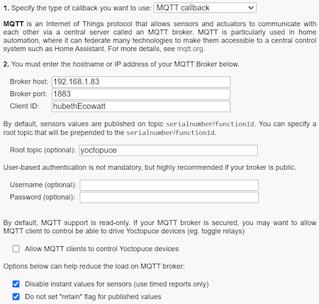 Le YoctoHub-Ethernet est capable de publier de manière autonome sur un broker MQTT les mesures des capteurs qui lui sont raccordés, lorsque ceux-ci transmettent des mesures périodiques. C'est la méthode la plus simple pour ajouter nos capteurs à Home Assistant. Grâce au mécanisme de discovery MQTT, nos capteurs apparaîtront spontanément dans Home Assistant une fois la configuration MQTT effectuée sur le YoctoHub-Ethernet: