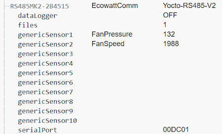 Les valeurs des capteurs de la ventilation, lues par le Yocto-RS485