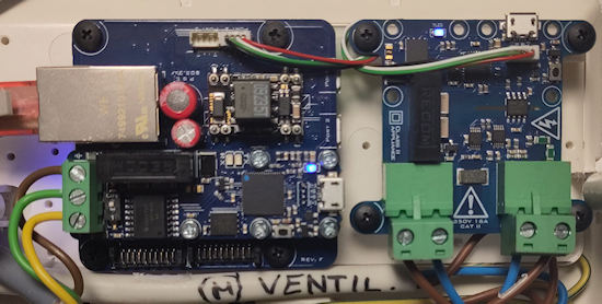 Assez logiquement, l'appareil de ventilation se trouve dans les combles - à cause de la sortie d'air humide sur le toit. Comme le système Home Assistant qui rassemble toutes les mesures de la maison est installé à la cave, le moyen le plus logique de les raccorder est d'utiliser le réseau Ethernet de la maison. Nous allons donc utiliser un YoctoHub-Ethernet pour ajouter une connectivité Ethernet à notre Yocto-RS485-V2, en les vissant l'un sur l'autre et en les connectant à l'aide d'une paire de connecteurs Board2Board-127. Et tant que nous y sommes, nous allons ajouter un Yocto-Watt qui permettra de mesurer en temps réel la consommation effective de la ventilation.