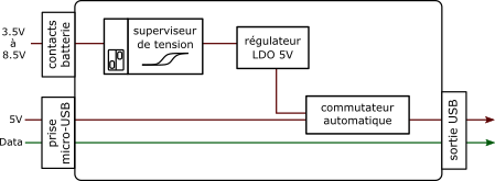 La masse (GND) de l'hôte USB et celle de de la batterie sont mises en commun par le circuit du Mini-Battery-Supervisor. Par contre, les lignes d'alimentation sont commutées et protégées contre le passage de courant d'une source à l'autre.